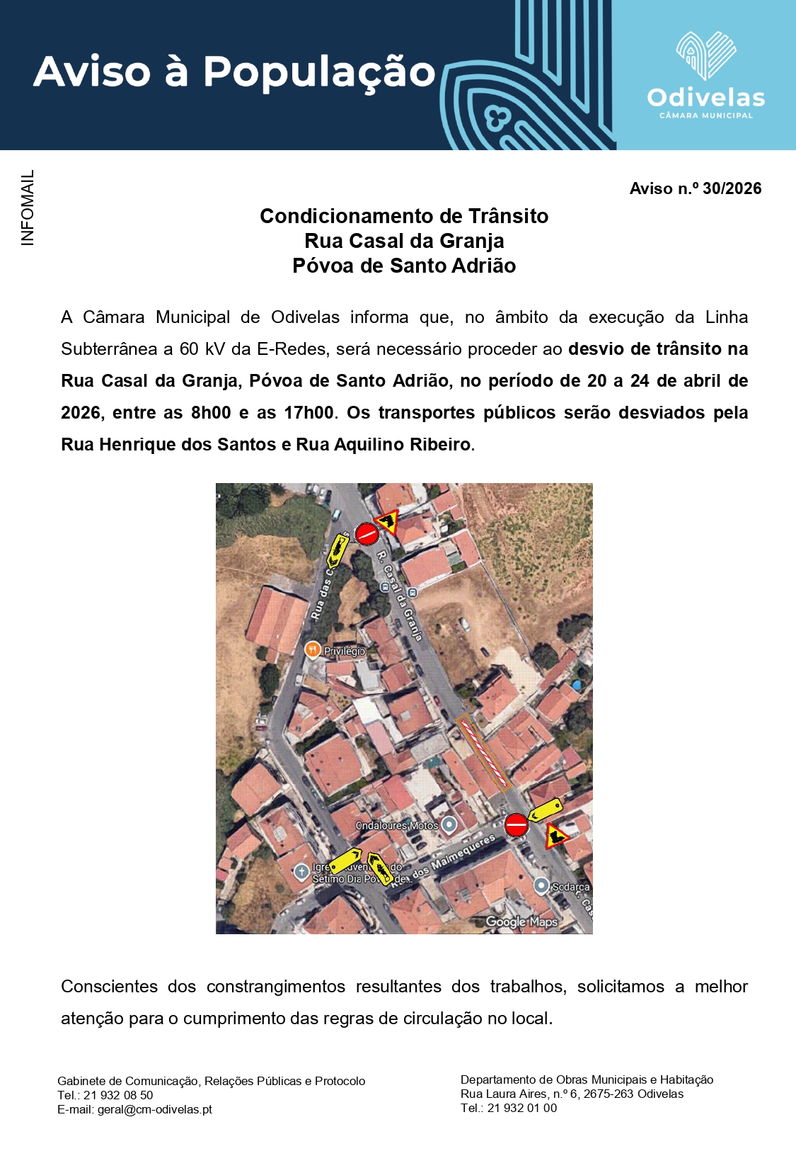 AVISO | Condicionamento de Trânsito Rua Casal da Granja, Póvoa de Santo Adrião